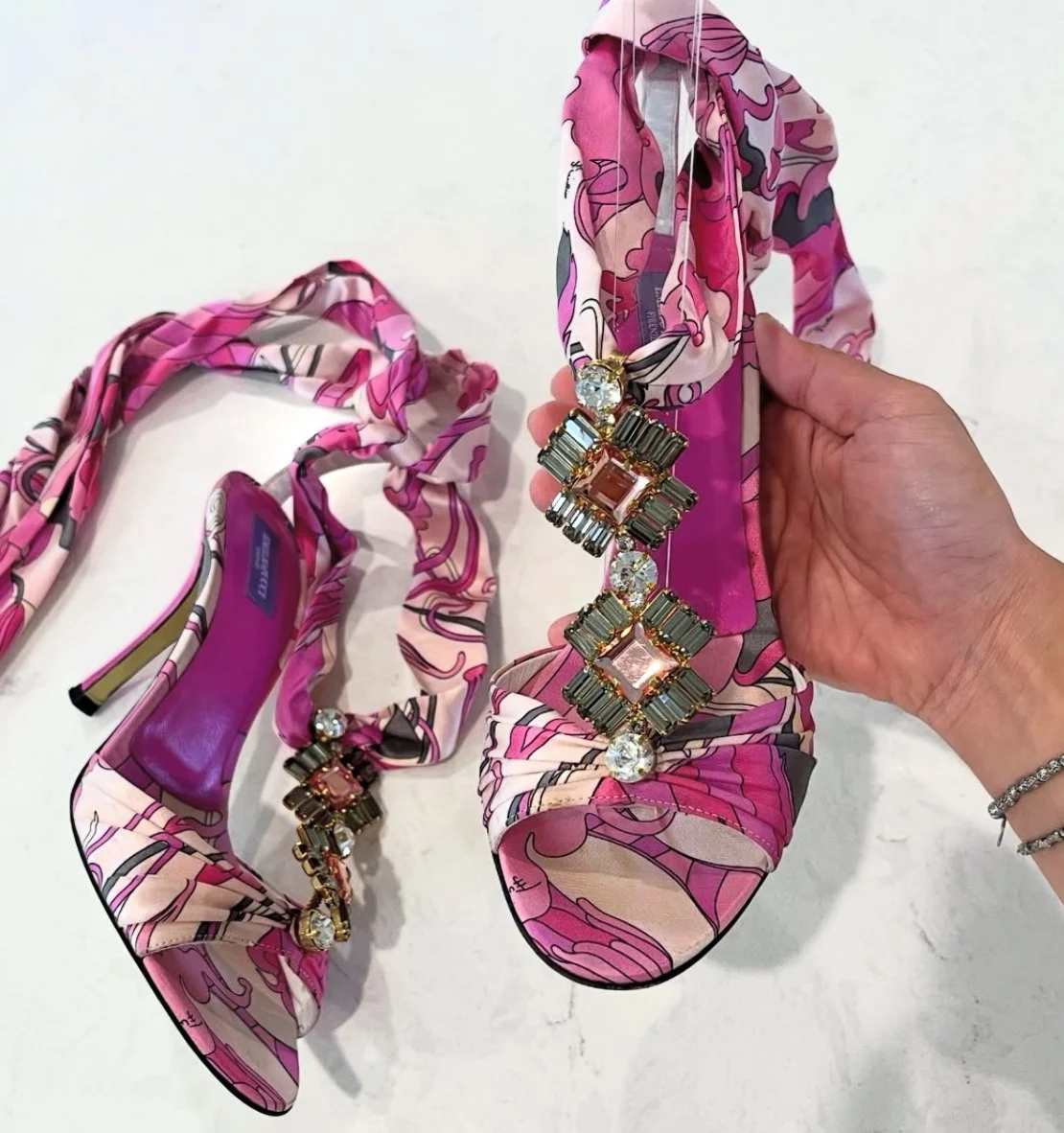We love the subtle polka dot pattern on these heels. They are not a true white; they are more of a cream-toned white.